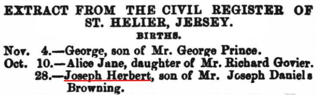He may have had a home on the island or Elizabeth had family there as this is where two of his and Elizabeth’s daughters were born. It is also where Walter, Elizabeth’s father died in 1858 Whatever the reason for moving to Jersey, Joseph & Elizabeth stayed there for about 8 years. And it is where their son Joseph Herbert Browning was born in 1859.