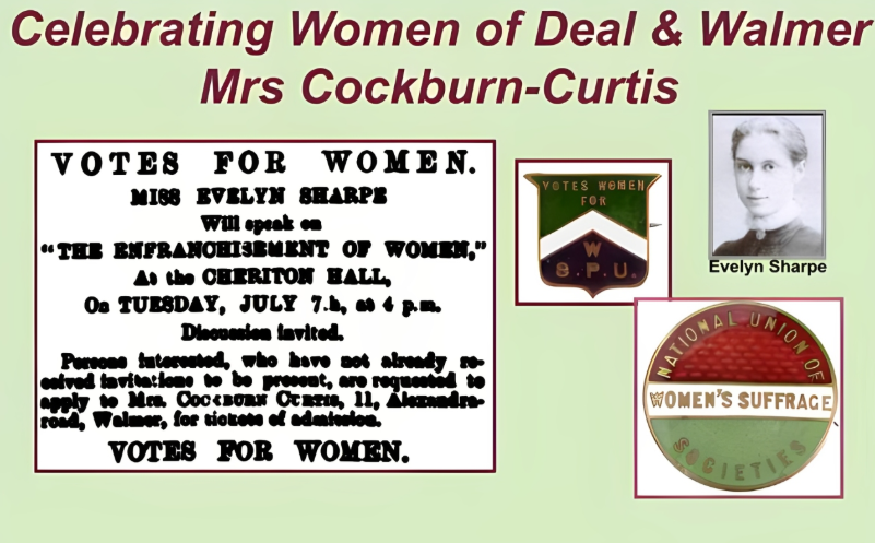 In 1908 Mrs. Eleanor Cockburn-Curtis organised a ‘Votes for Women’ meeting in Walmer The meeting was held at Cheriton Hall, on North Barrack Road with Evelyn Sharpe of the Women’s Social & Political Union as the main speaker.